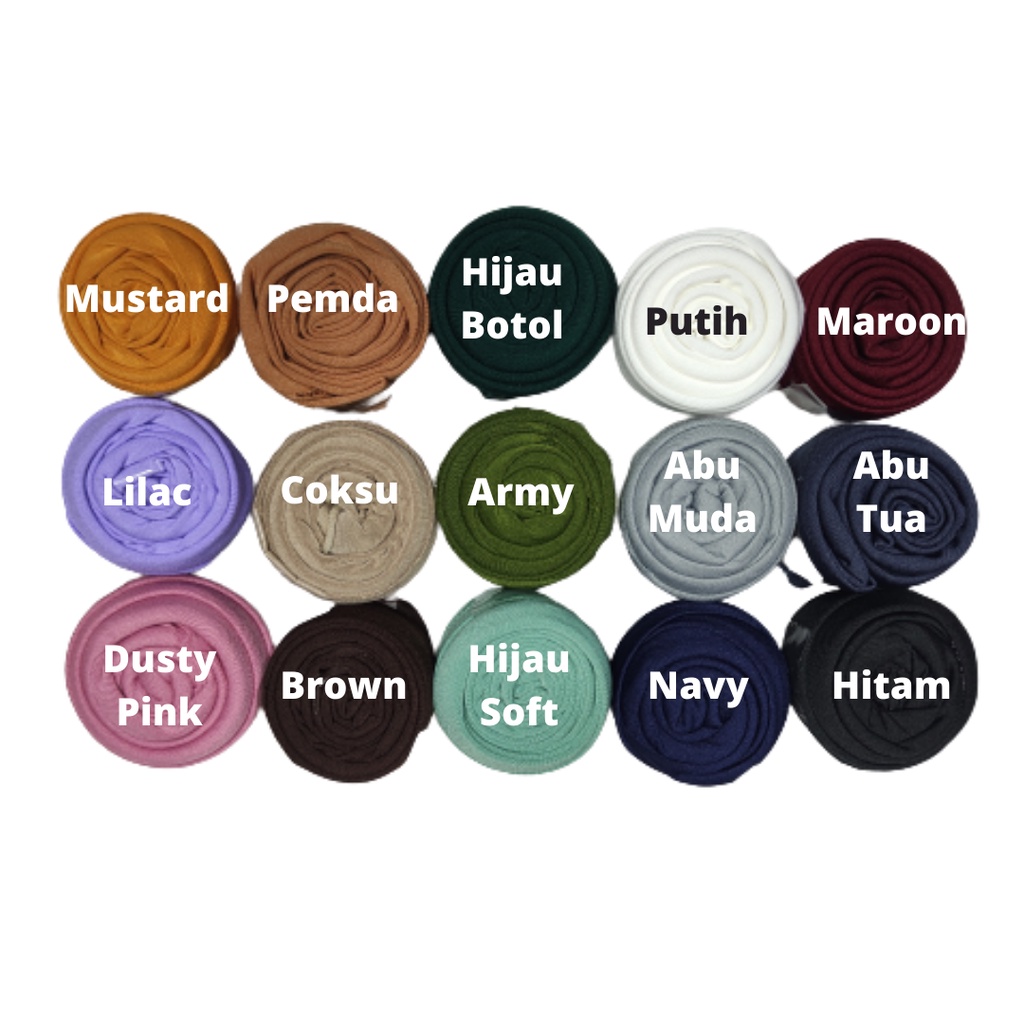 Produk ini memiliki 34 Variasi Warna yaitu : Hitam,Navy,Putih,Maroon,Mustard,Lilac,Abu Muda,Abu Tua,Coksu,Brown,Dusty Pink,Pemda,Hijau Botol,Hijau Soft,Army,Dark Brown,Cream,Denim,Honey Cream,Kubus,Lavender,Nude,Oat,Rose,Pink Nude,Salem,Taro,Turkish,Wardah,Milo,Mocca,Coffee,Biru Muda,GreenTea,